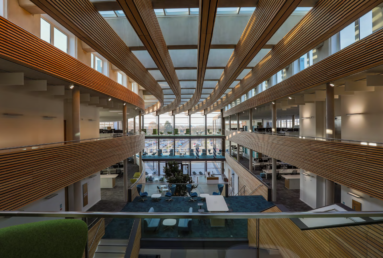 The development was built on the existing site, and consists of two three-storey buildings connected by a central glazed atrium. The 850-workforce remained operational within the existing offices, and access was maintained throughout the project. With the new HQ now complete, the existing offices will be demolished, and the land redeveloped.